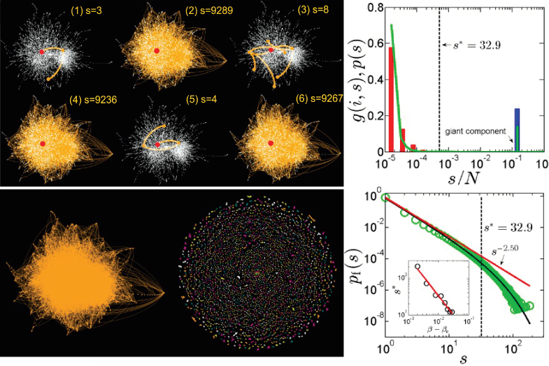 值得一提的是,该成果未发表之前,挂在Arxiv上的版本已经被综述性杂志Physics Reports(IF:22)上的文章做了详细介绍,评价我们的结果为:“利用SIR家族传播动力学与边渗流的关,胡等发现了SIR家族传播动力学中的核心规律—传播结果只能为两个状态之一:一个为局部态,另一个为全局态。这个发现是非常深刻的,而且激动人心,一个节点或者一组节点的全局影响力只用局部网络信息就可以精确度量。”