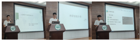 考研经验分享专场由17级信息与计算科学专业陈俊志(成功考上本院计算数学专业研究生)、蓝煜航(成功考上本院网络空间安全专业的)和17级保密管理专业王新宇(成功考上浙江大学计算机学院电子信息计算机技术)三位同学分享。