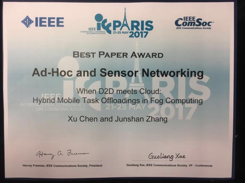 2017年5月21日至25日, IEEE国际通信大会(IEEE International Conference on Communications,简称IEEE ICC)在法国首都巴黎召开。会上,中山大学数据科学与计算机学院陈旭教授与美国亚利桑那州立大学章君山教授合作完成的论文《When D2D Meets Cloud: Hybrid Mobile Task Offloadings in Fog Computing》获大会最佳论文奖(Best Paper Award)。该论文是本届会议在自组织与传感器网络(Ad Hoc and Sensor Networking)领域的唯一获奖论文。